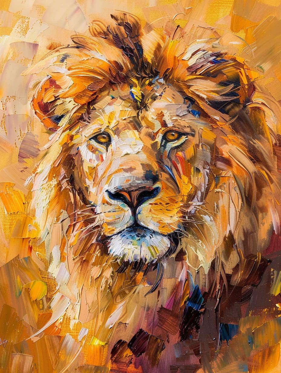 Majestic lion oil painting by Kwame Mensah — glowing golden tones and expressive brushstrokes evoke African sunlight and royal strength.