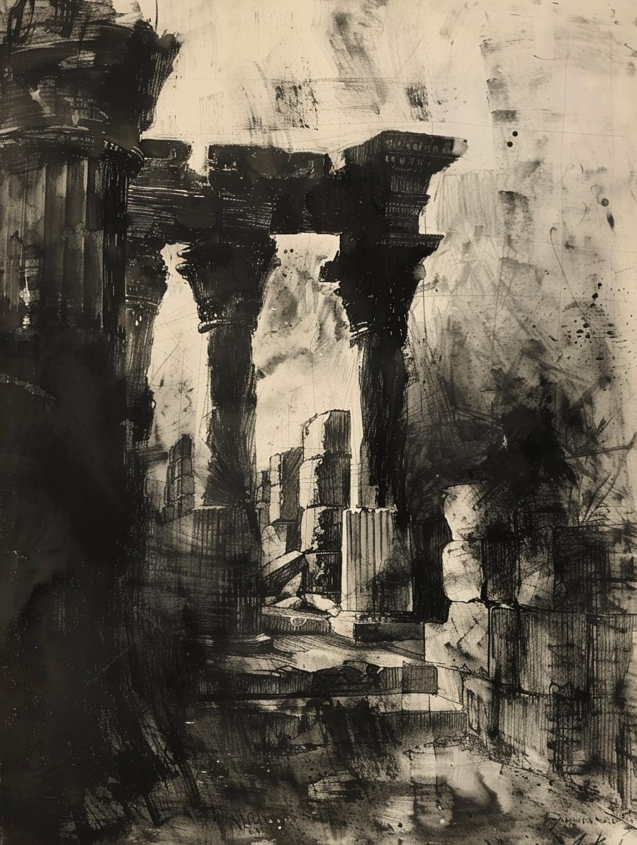 Charcoal drawing by Chipo Mwansa — ancient temple ruins in dramatic light and shadow. A handmade, timeless black-and-white work of quiet power.