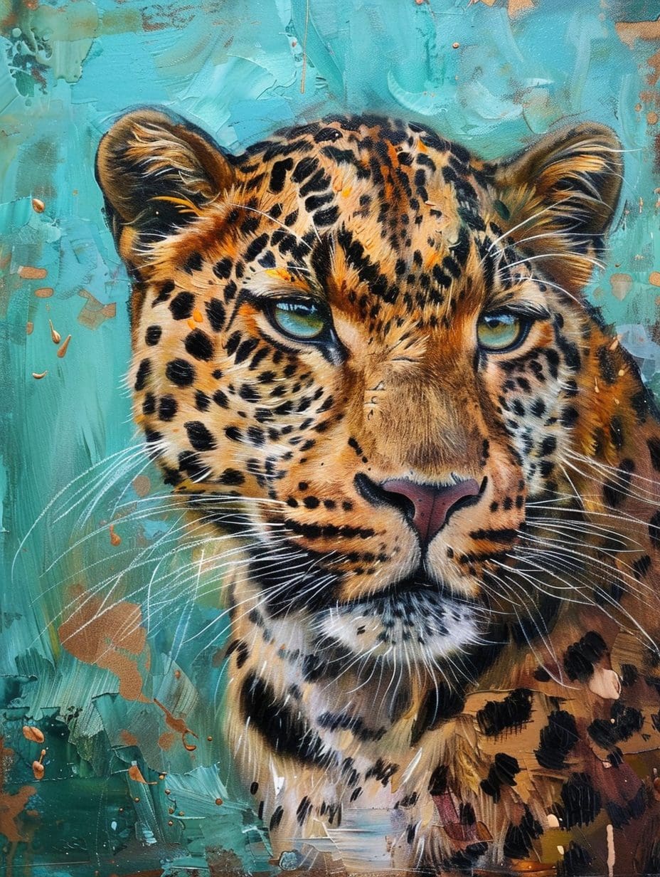Expressive leopard portrait by Kwame Mensah — detailed eyes, textured brushwork, and a glowing blue-green backdrop. A striking modern wildlife artwork.