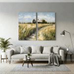 In “Path to Stillness”, Achieng Njeri evokes the quiet rhythm of rural life through soft, impressionist brushwork and golden, wind-swept fields. A narrow dirt path meanders toward a weathered wooden barn, while tall grasses bend gently under a warm, muted sky.