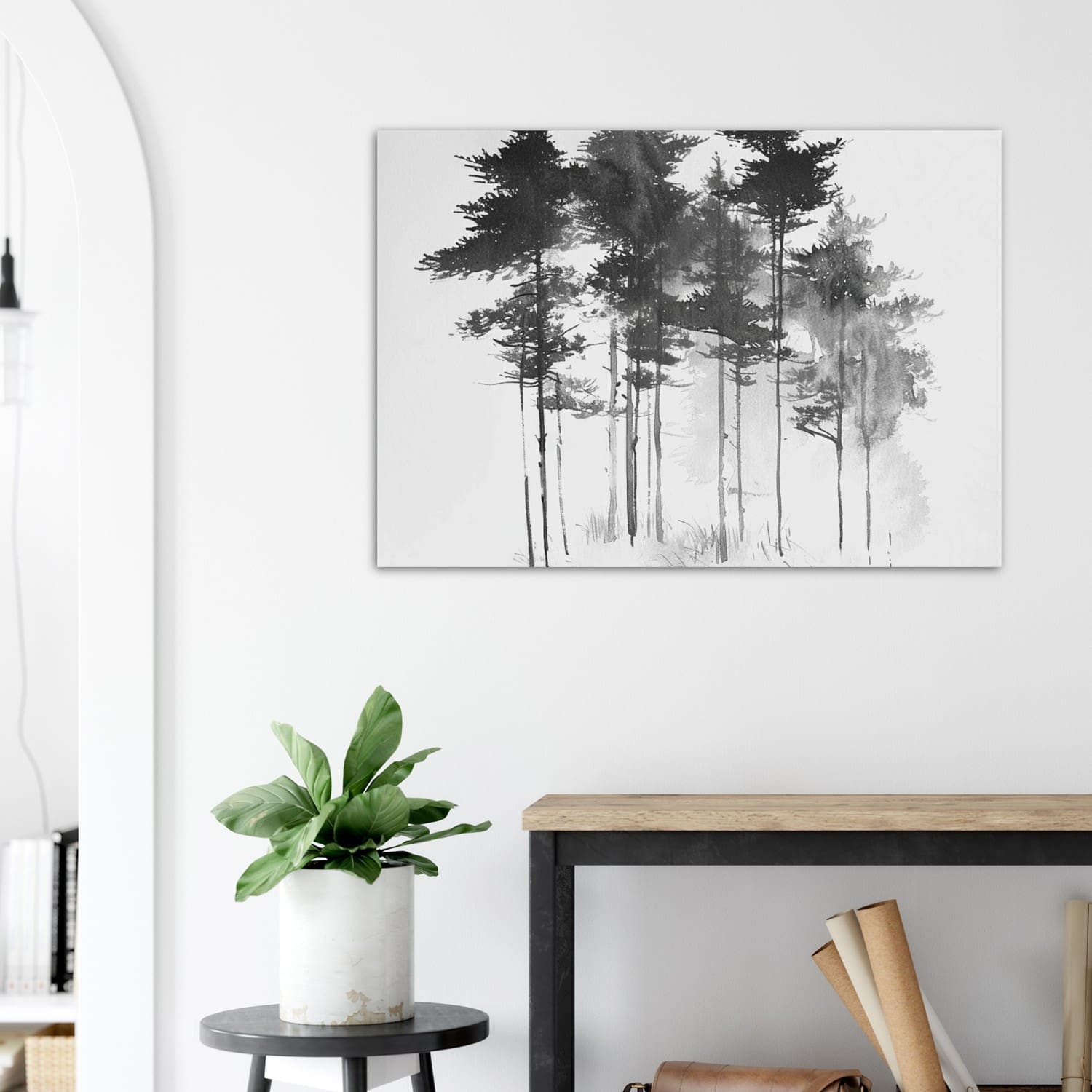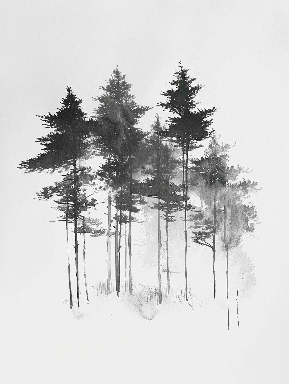 In “Silent Pines”, Amara Tesfaye captures the meditative stillness of a quiet forest rendered in graceful black ink. Tall pines rise through soft mist, their forms reduced to essential brush gestures inspired by Japanese sumi-e tradition.