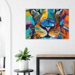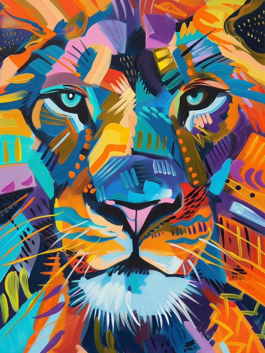 Abstract African lion painting by Amina Okoye — bold colors, geometric patterns, and expressive eyes create a vibrant, powerful modern wall art statement.