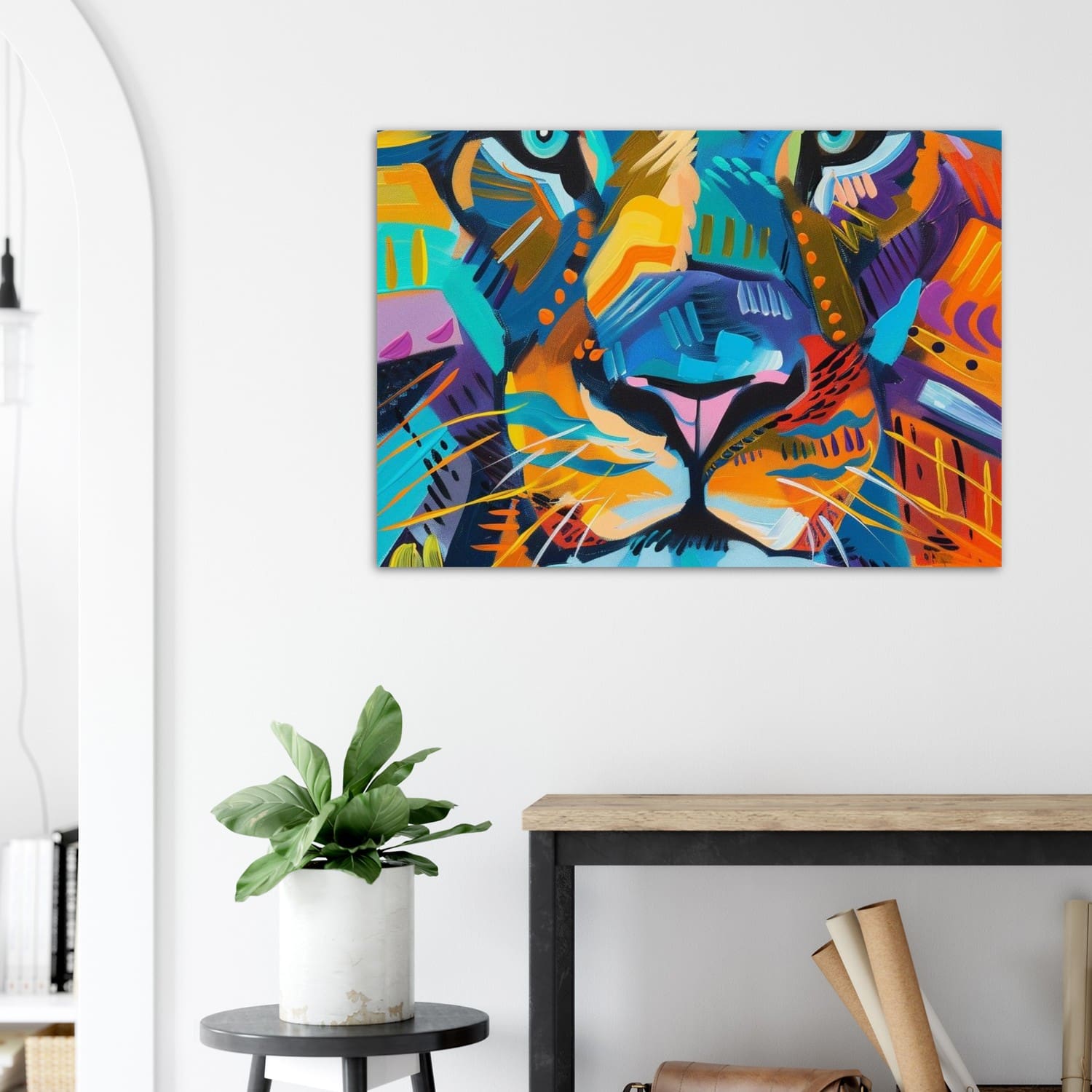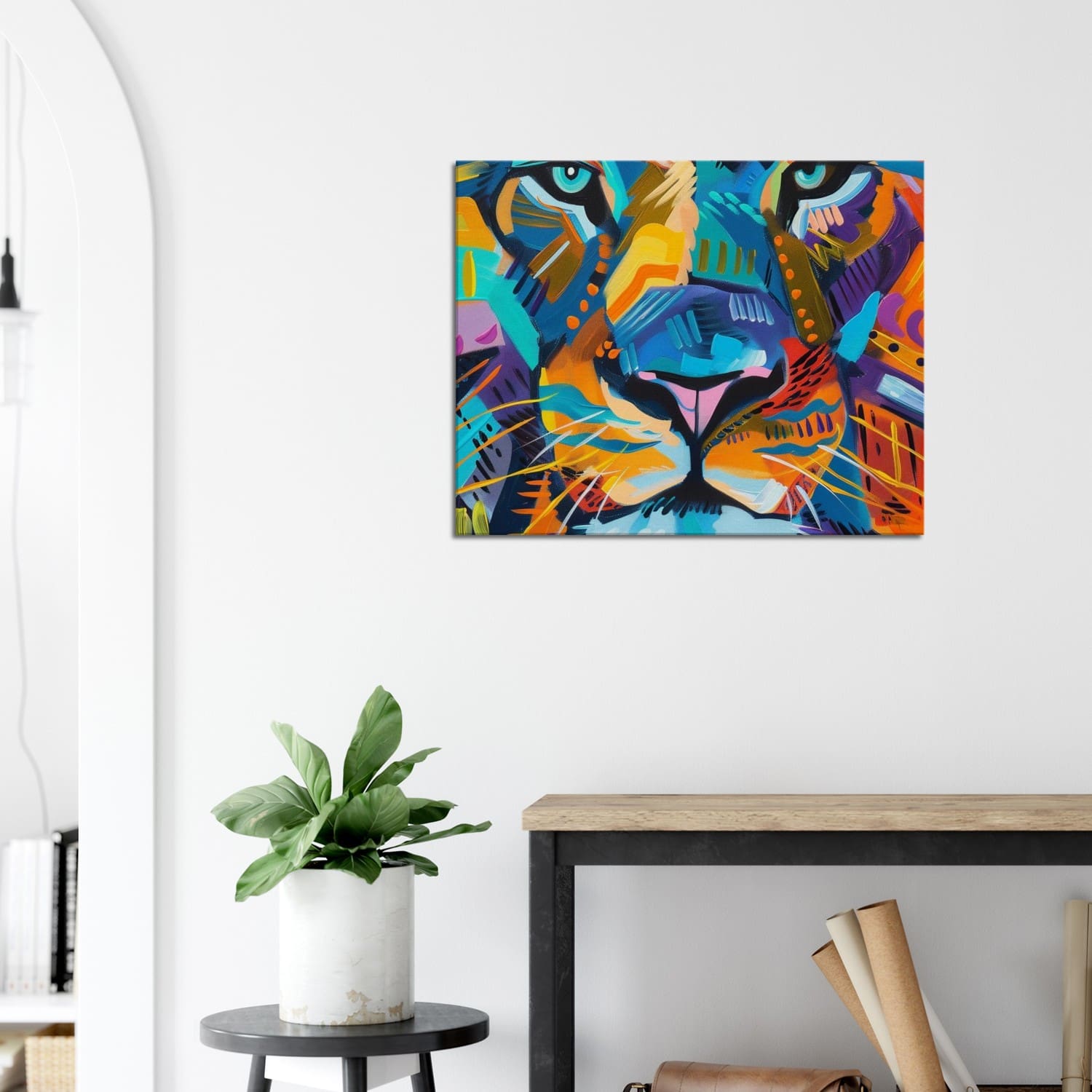 Okoye’s signature fusion of symbolism and modernity gives the lion’s eyes a soulful depth amid a kaleidoscope of form and color. This striking piece radiates strength, pride, and vitality, making it an ideal centerpiece for spaces that celebrate art, culture, and individuality.