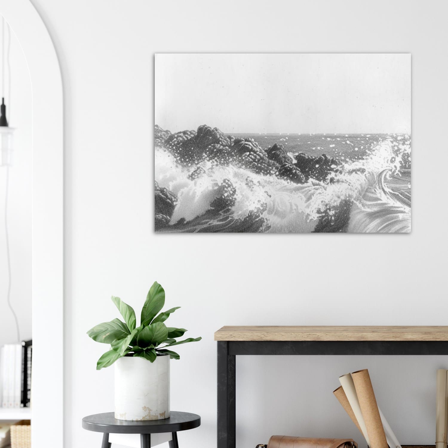 Tesfaye’s refined linework and tonal precision create a sense of depth and realism while maintaining the quiet poetry of black and white. This coastal illustration embodies balance and contemplation, making it an elegant statement piece for minimalist or nature-inspired interiors.