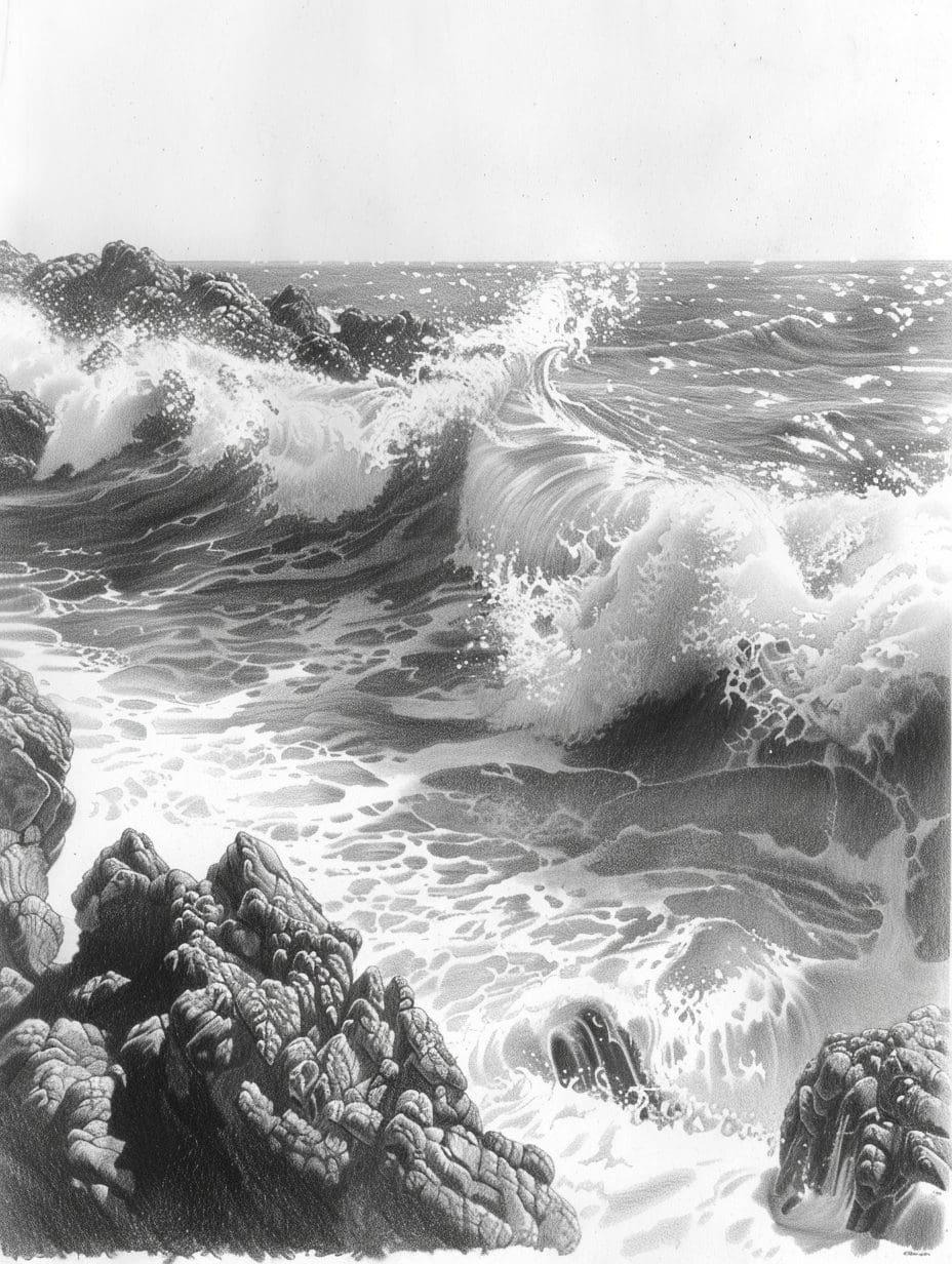“Tides of Silence” by Amara Tesfaye captures the mesmerizing rhythm of the sea through intricate pencil work. Each stroke reveals the tension between motion and stillness — waves crashing against rocks, frozen in delicate shades of graphite.