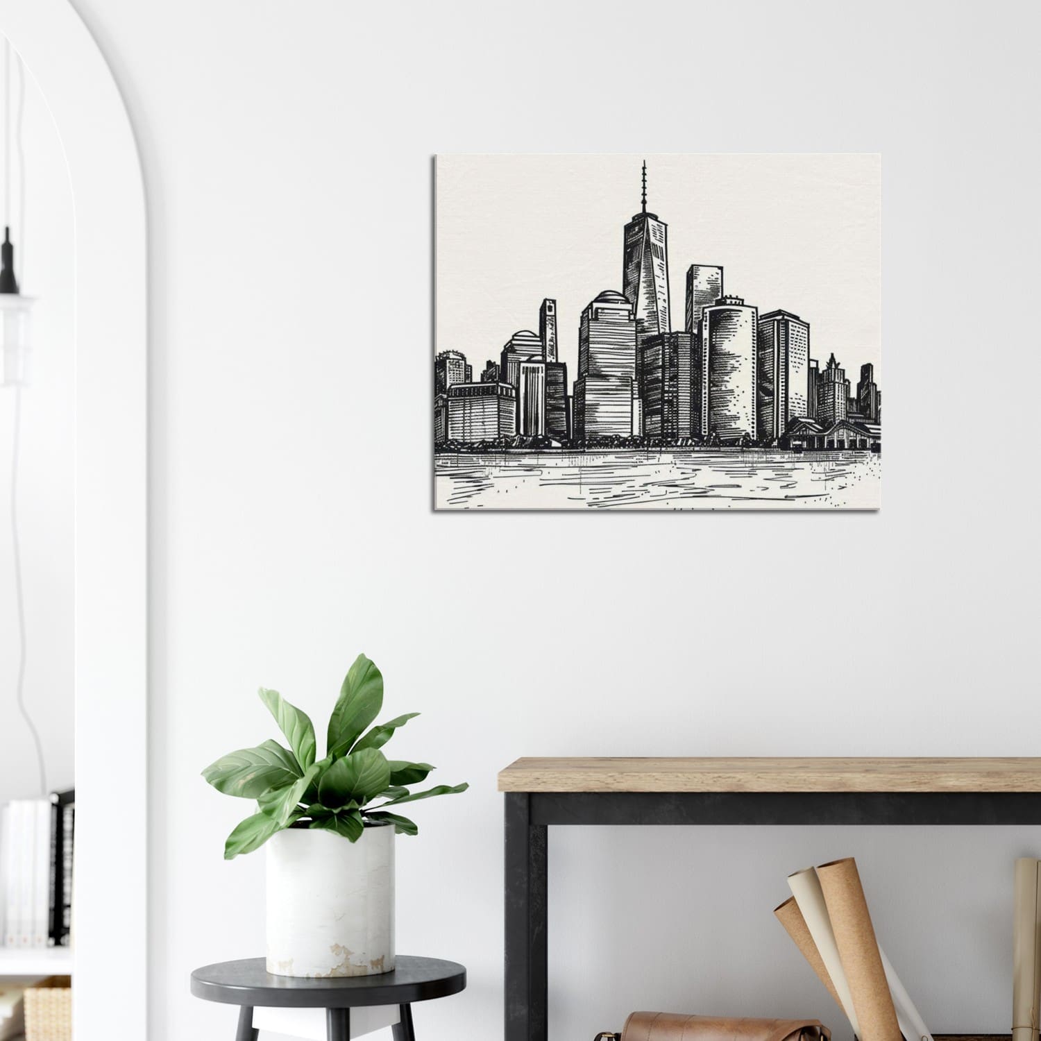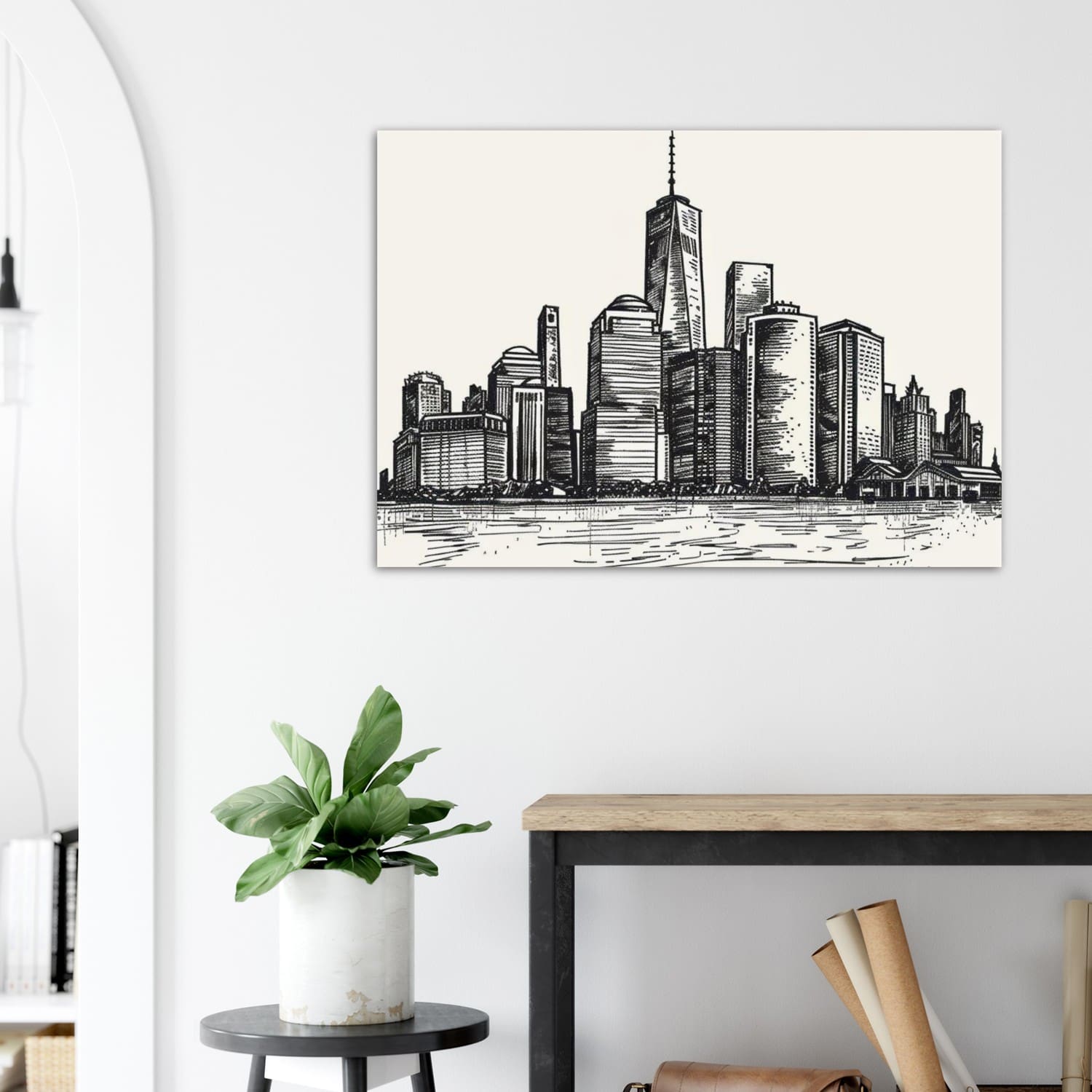Jacobs’ minimalist technique combines precision and poise, transforming architectural form into quiet poetry. This refined black-and-white illustration embodies sophistication and balance, ideal for contemporary interiors that appreciate design, structure, and understated beauty.