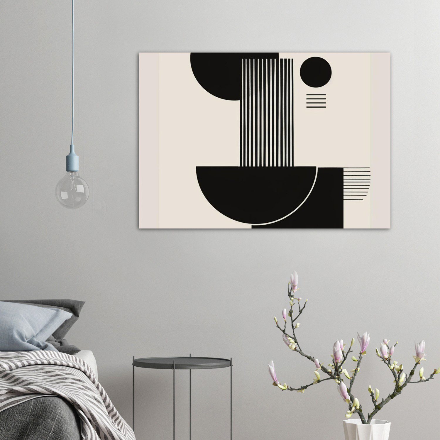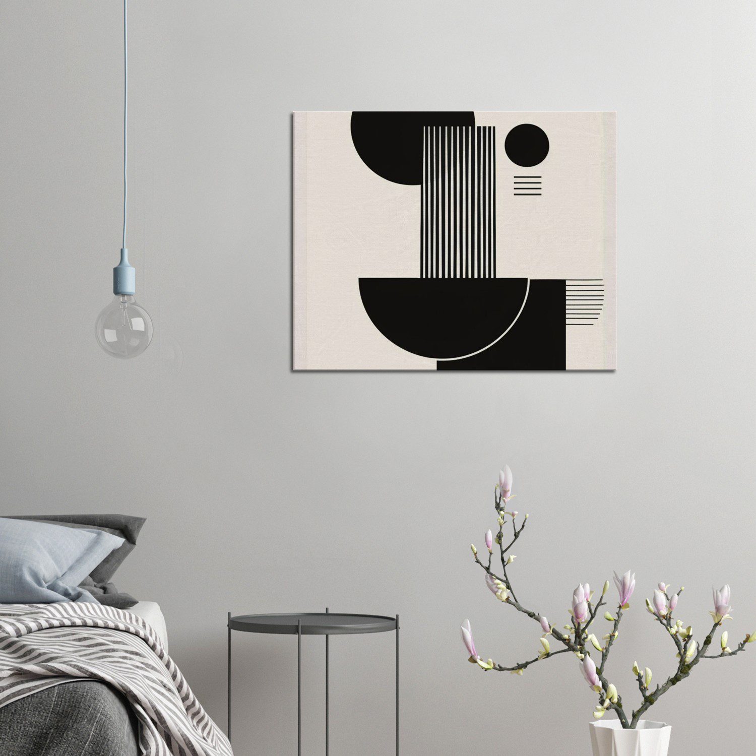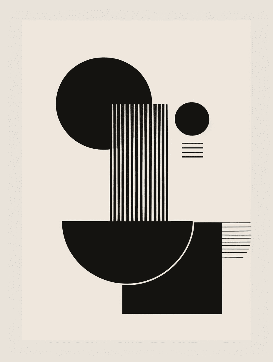 A minimal brutalist abstract poster featuring black shapes on a light background with architectural balance.
