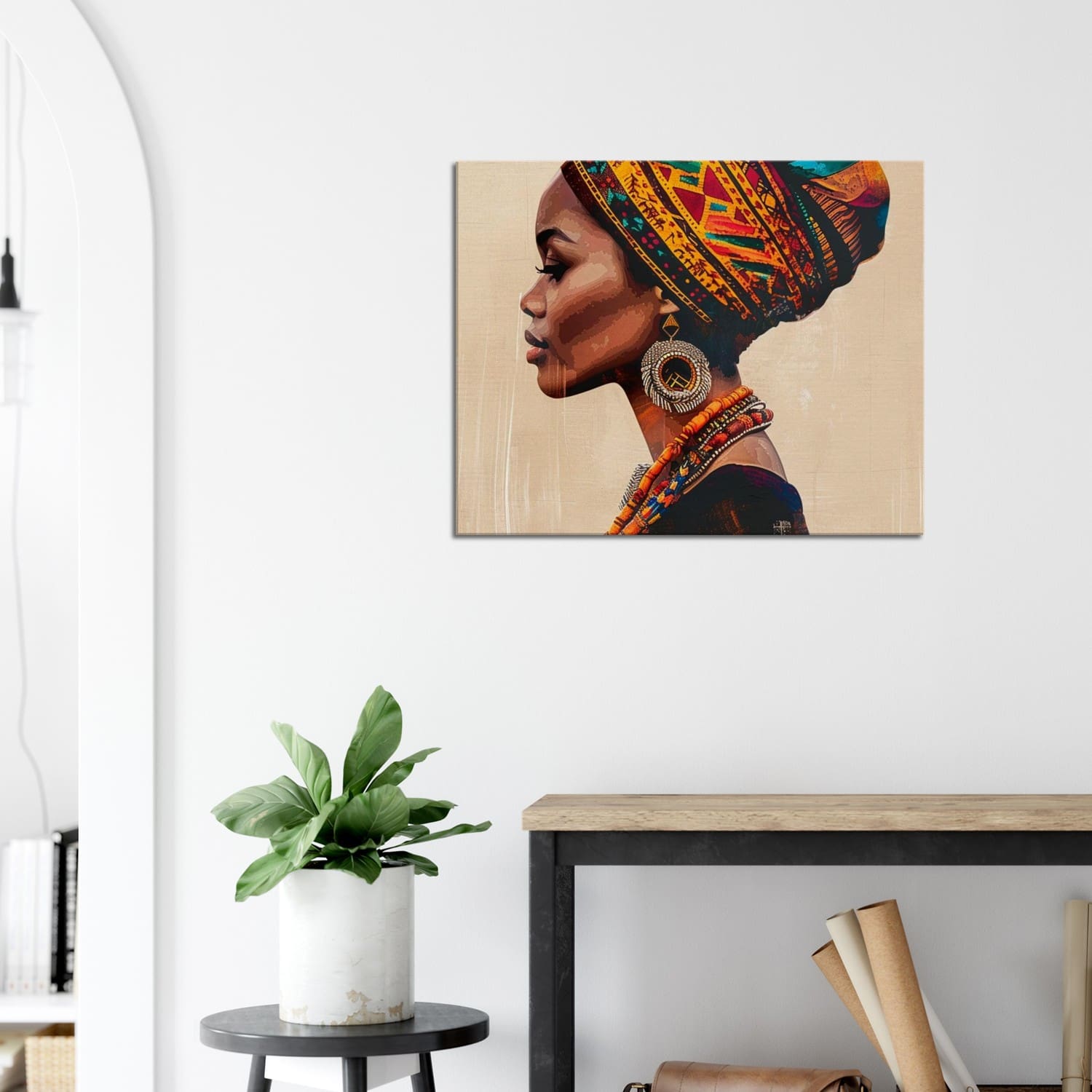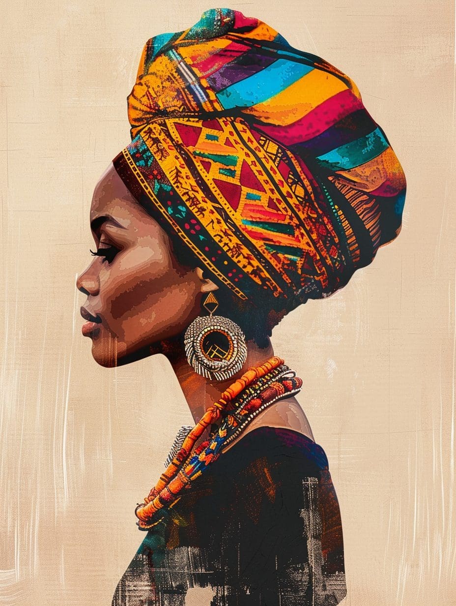Minimalist portrait of an African woman by Sade Bamidele, featuring a colorful headwrap and jewelry on a neutral background. Modern, elegant, and expressive wall art.