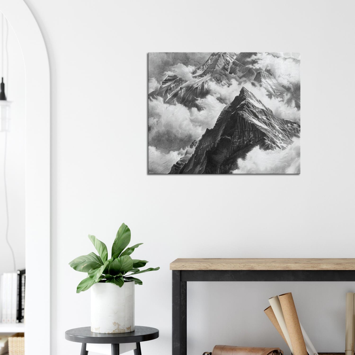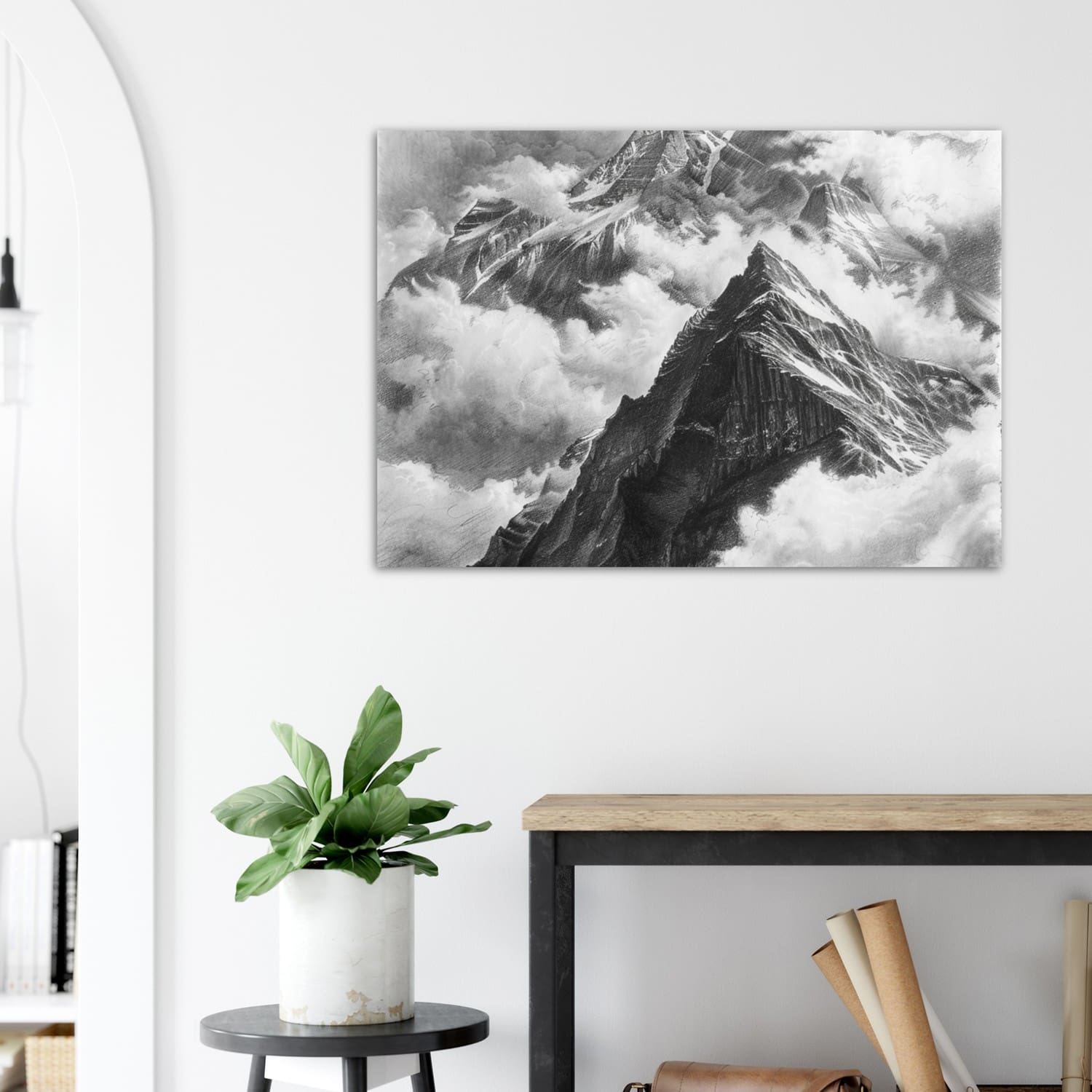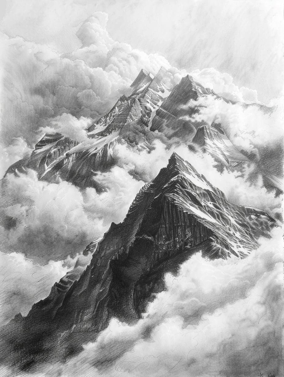 Realistic charcoal landscape by Naledi Kgosi, featuring softly shaded mountains and clouds. A timeless, handcrafted wall art print with natural beauty.