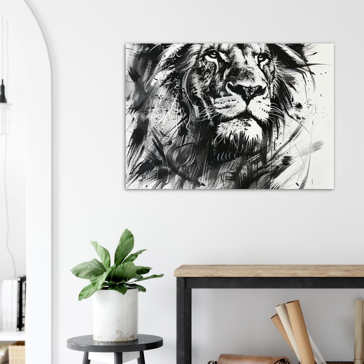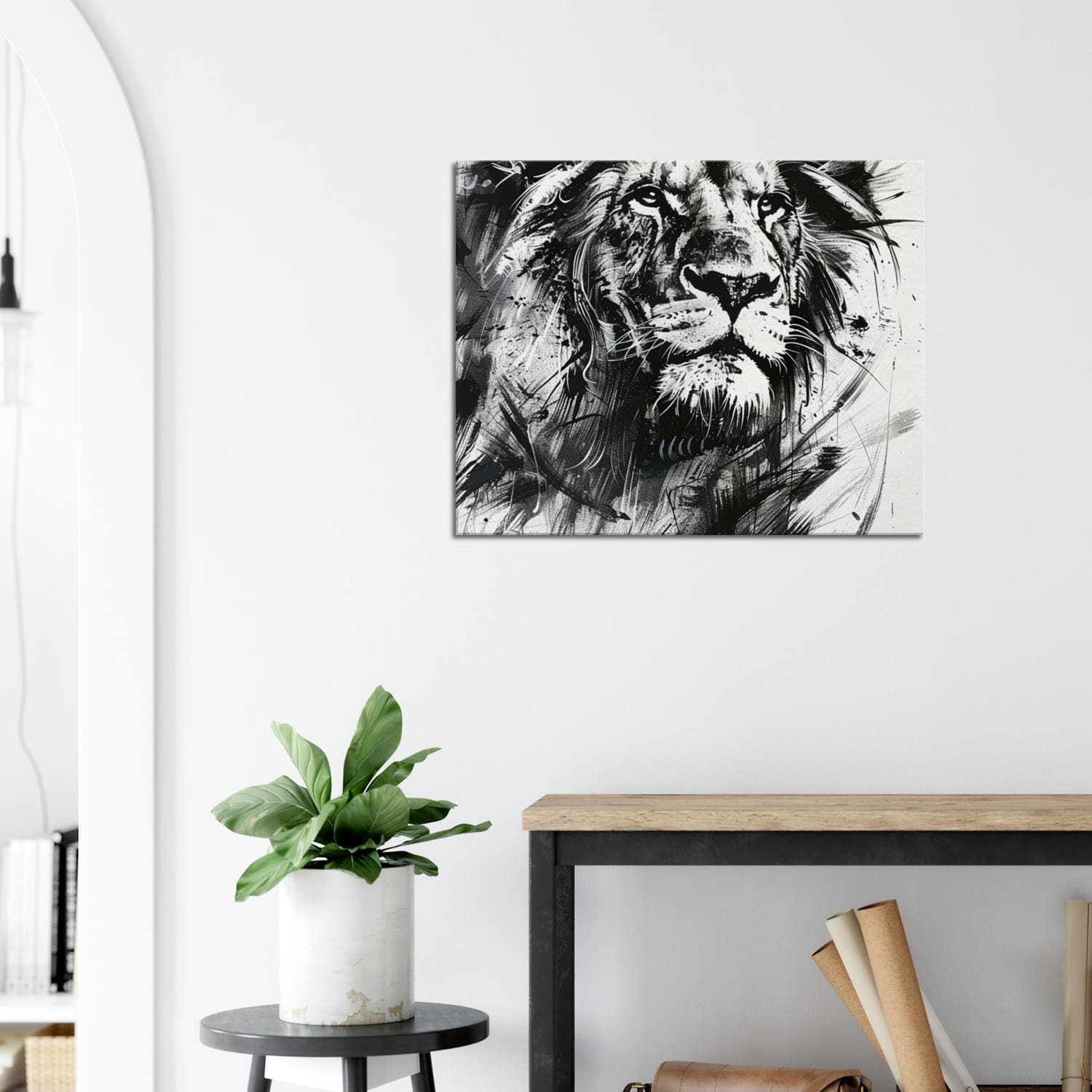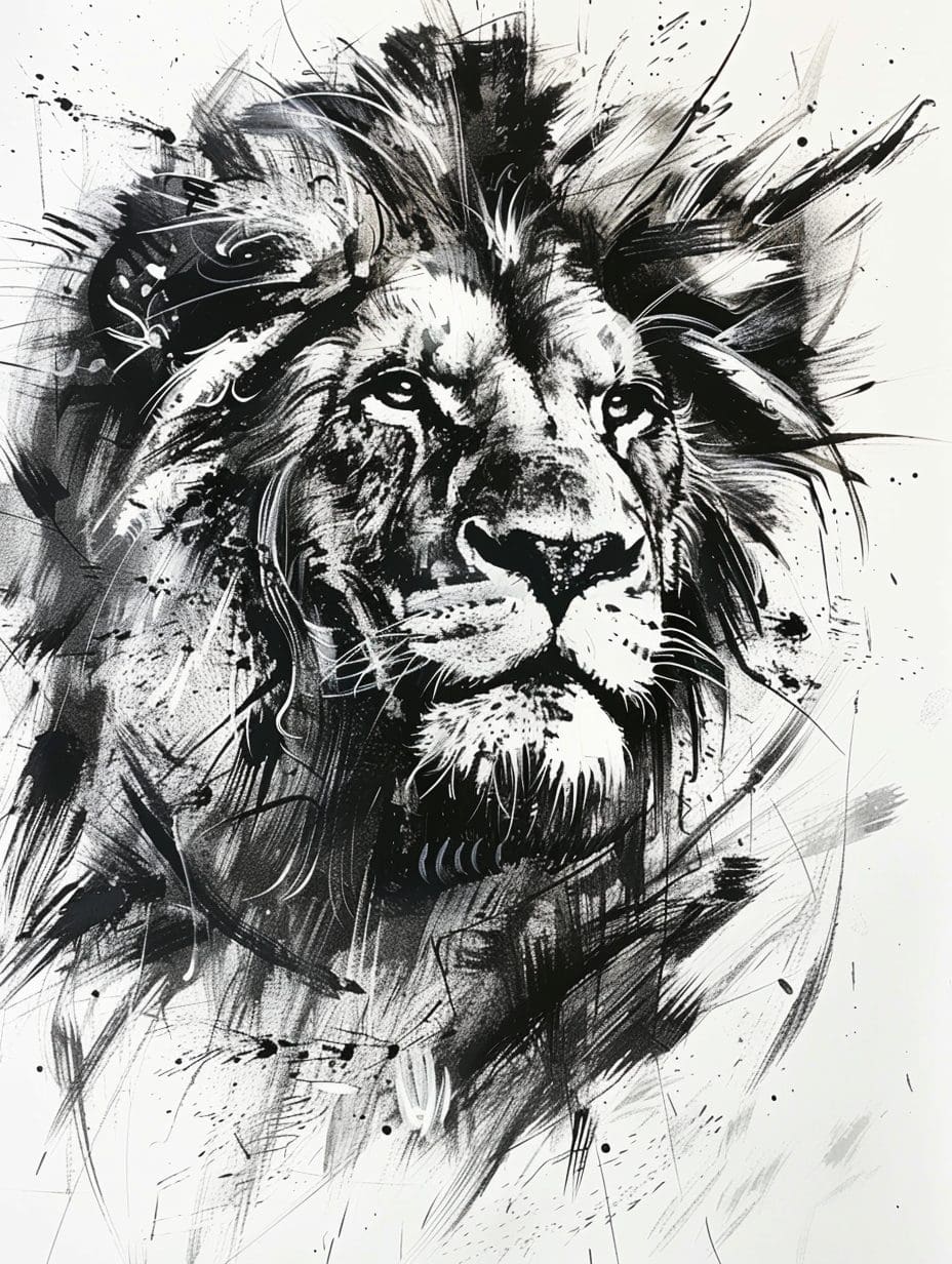 Black-and-white ink lion portrait by Kwame Mensah. Expressive brushwork, fine detail, and strong gaze create a powerful hand-drawn wildlife piece.