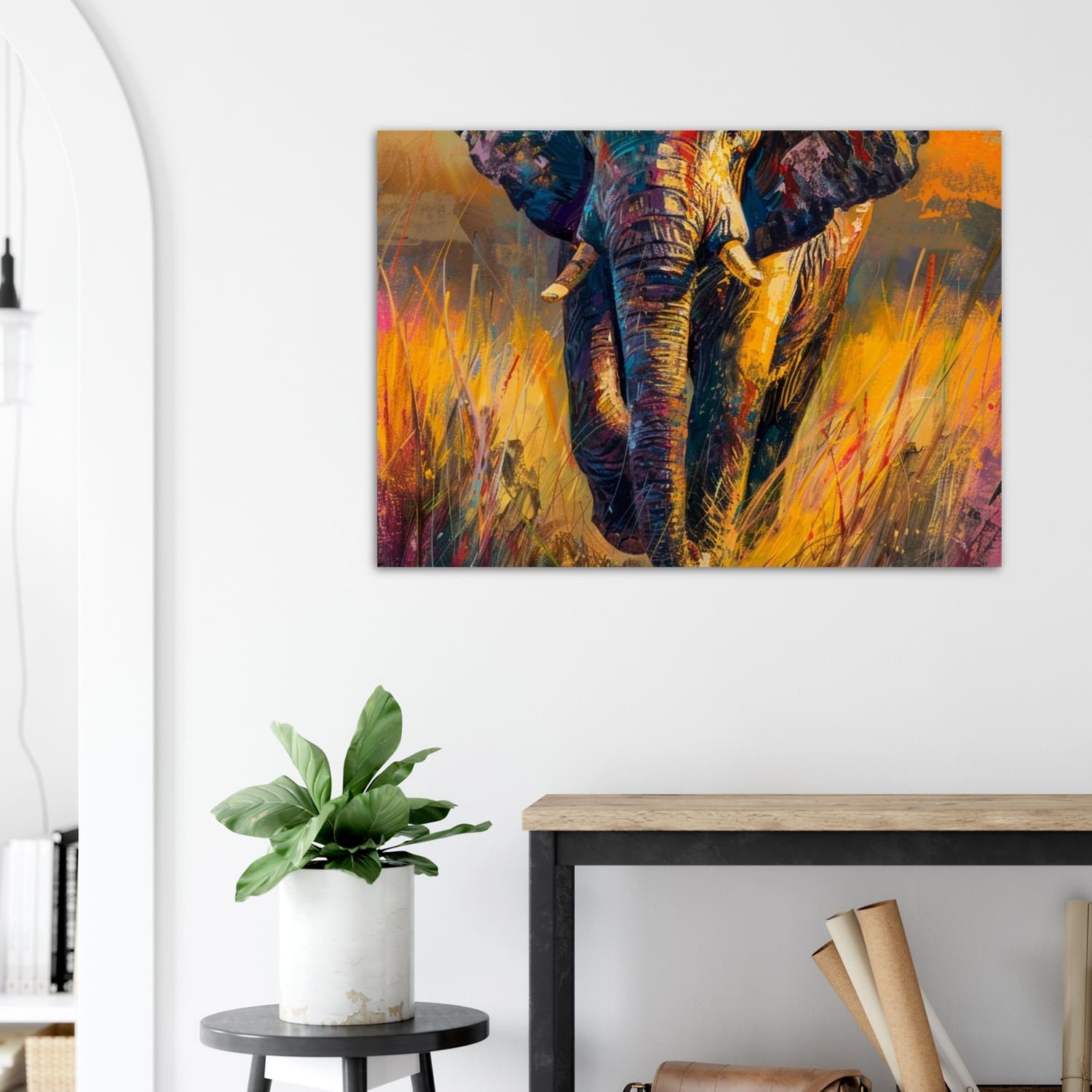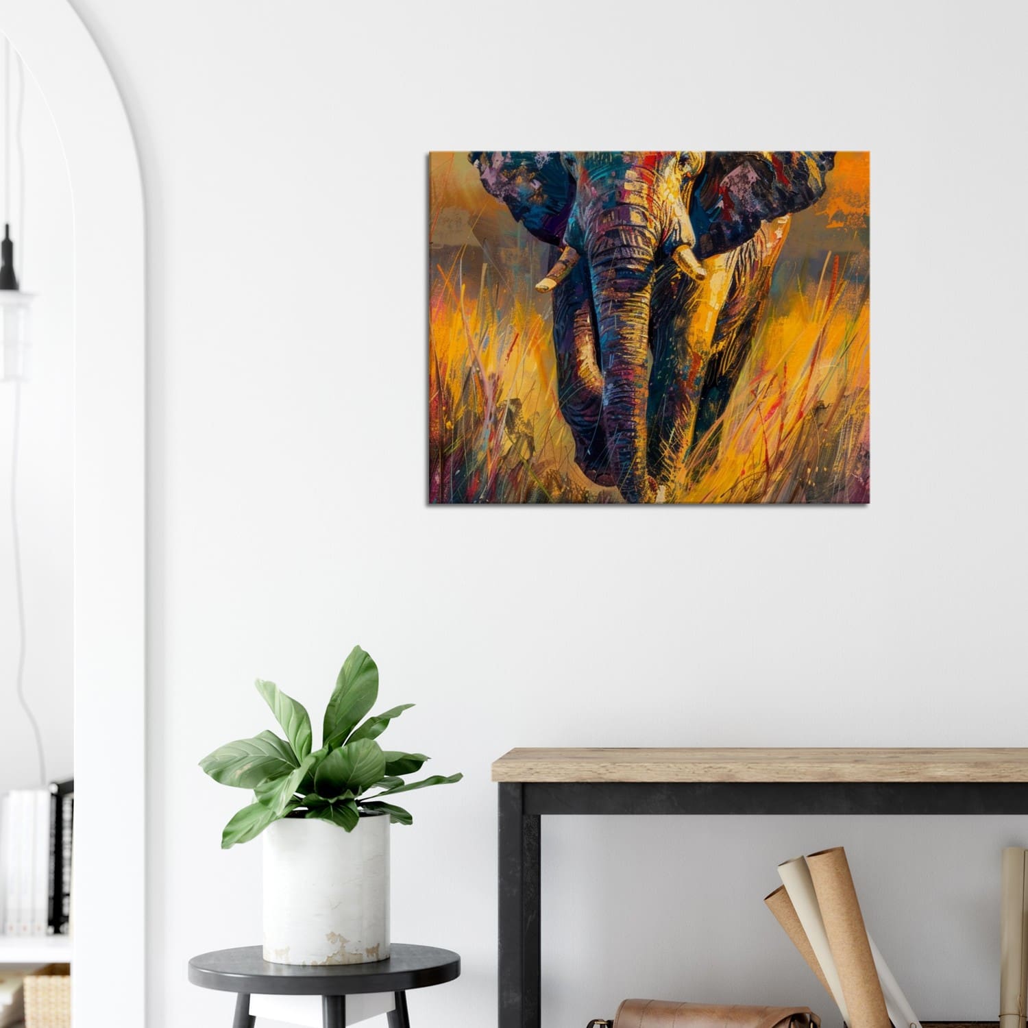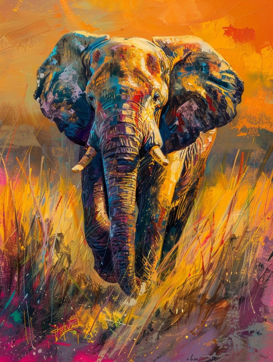 Colorful African elephant painting by Kwame Mensah — warm sunset tones, expressive brush texture, and elegant savanna atmosphere.
