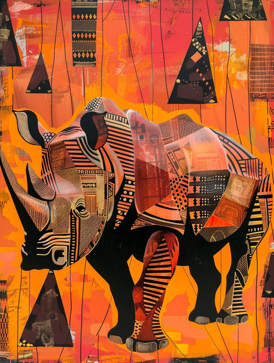 Modern African rhino painting by Amina Okoye — geometric tribal design, bold lines, and a striking orange-black palette in a refined luxury style.