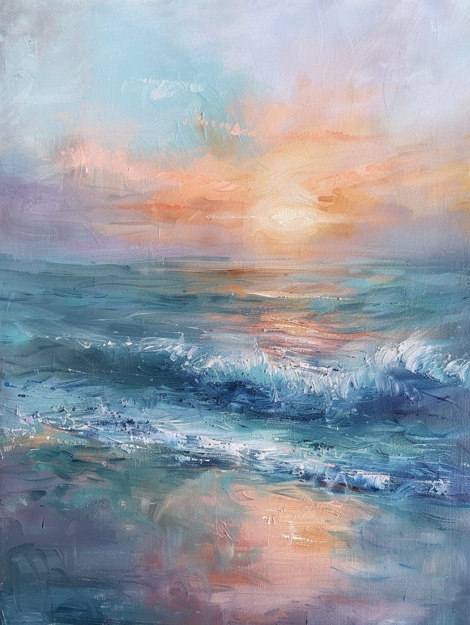 Impressionist seascape by Amara Tesfaye — the sea at sunrise painted in soft pastels and loose brushstrokes. A serene, Monet-inspired artwork.