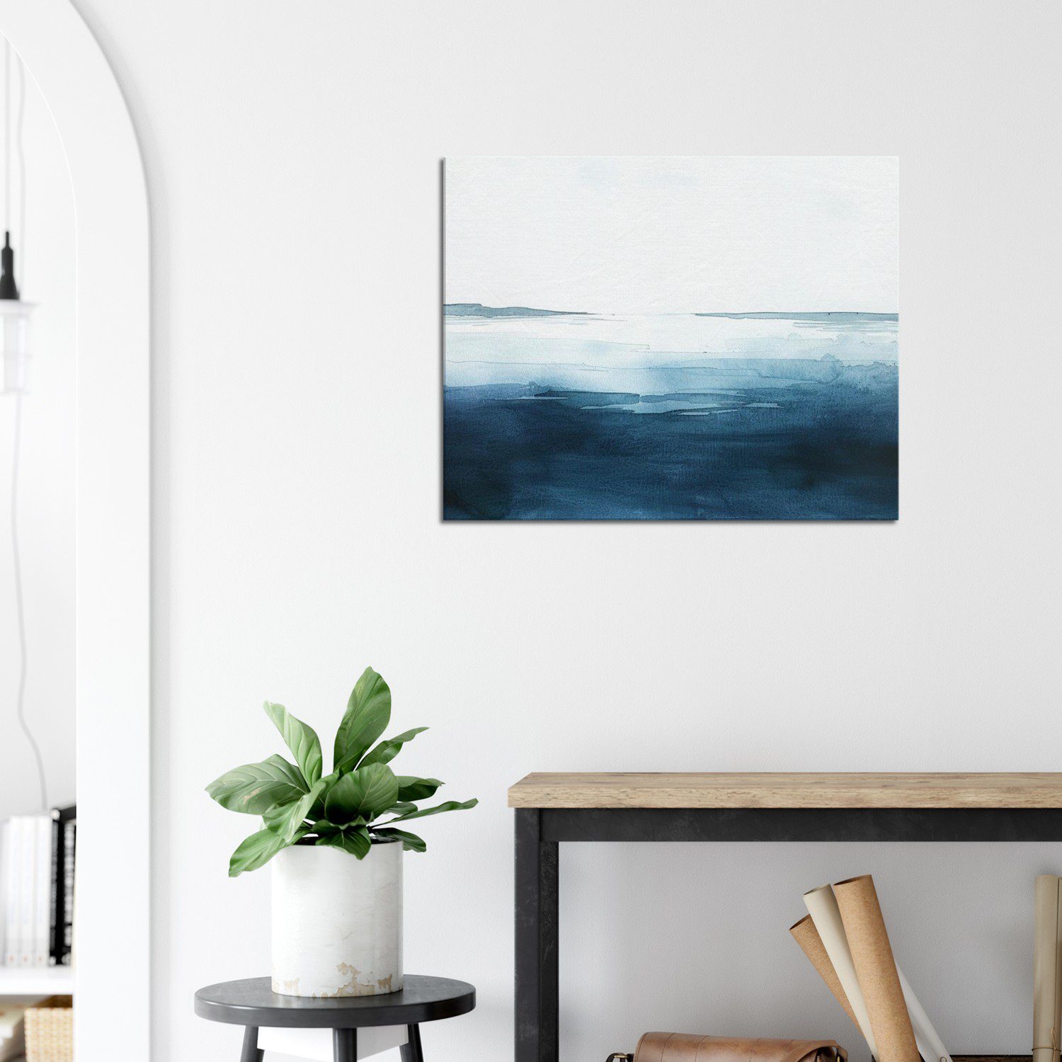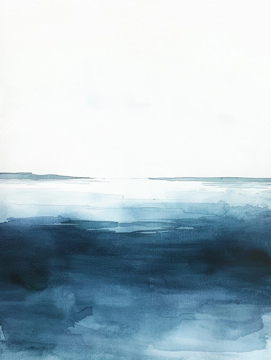 Minimalist watercolor seascape by Zuri Wanjiku — soft blue gradients and open white space evoke calm, balance, and modern elegance.