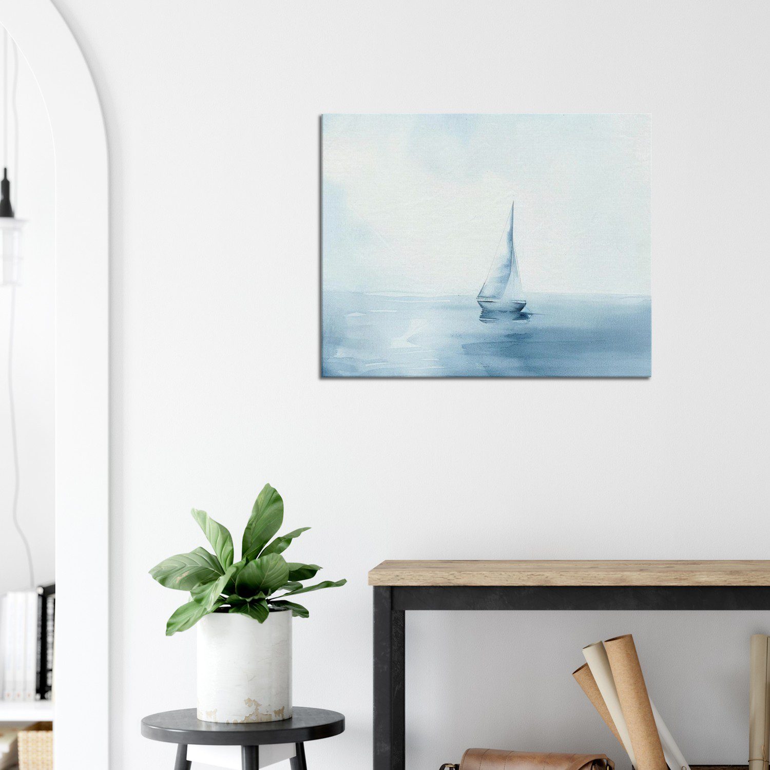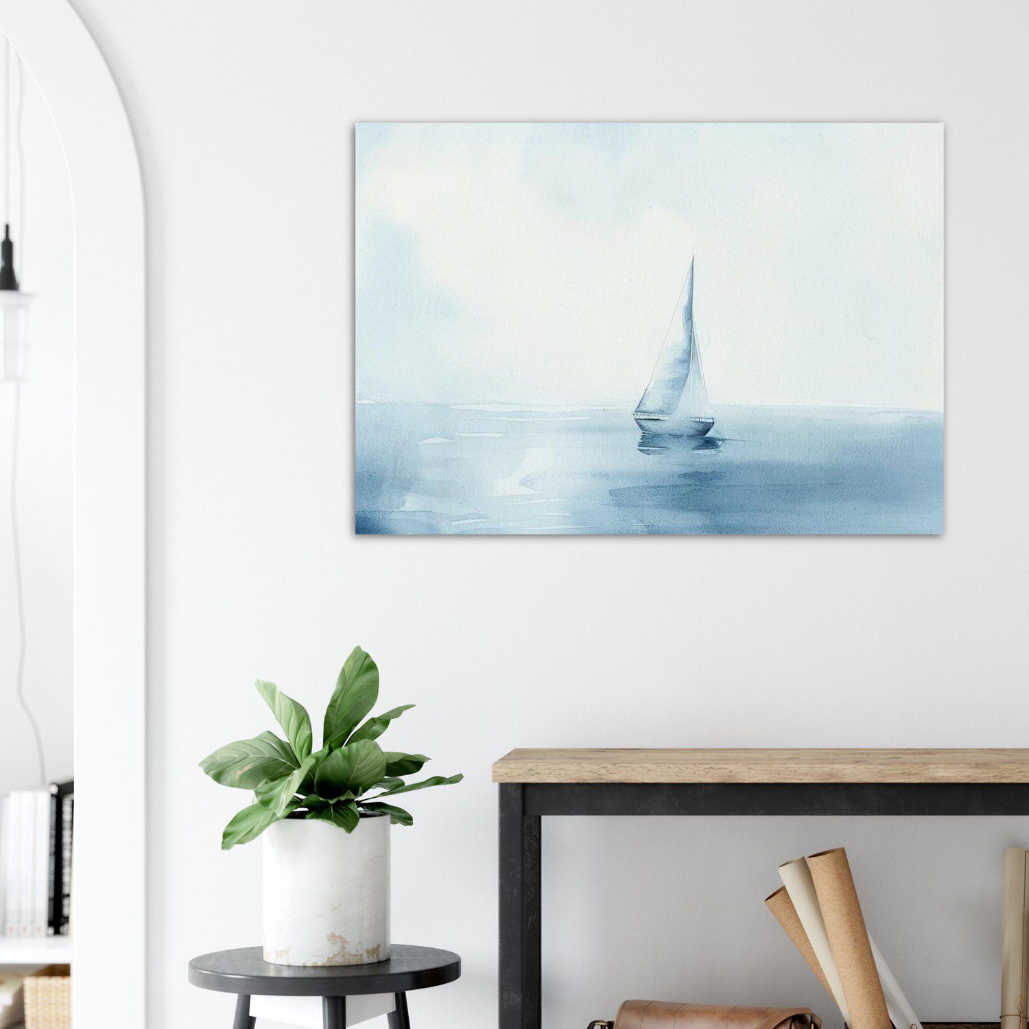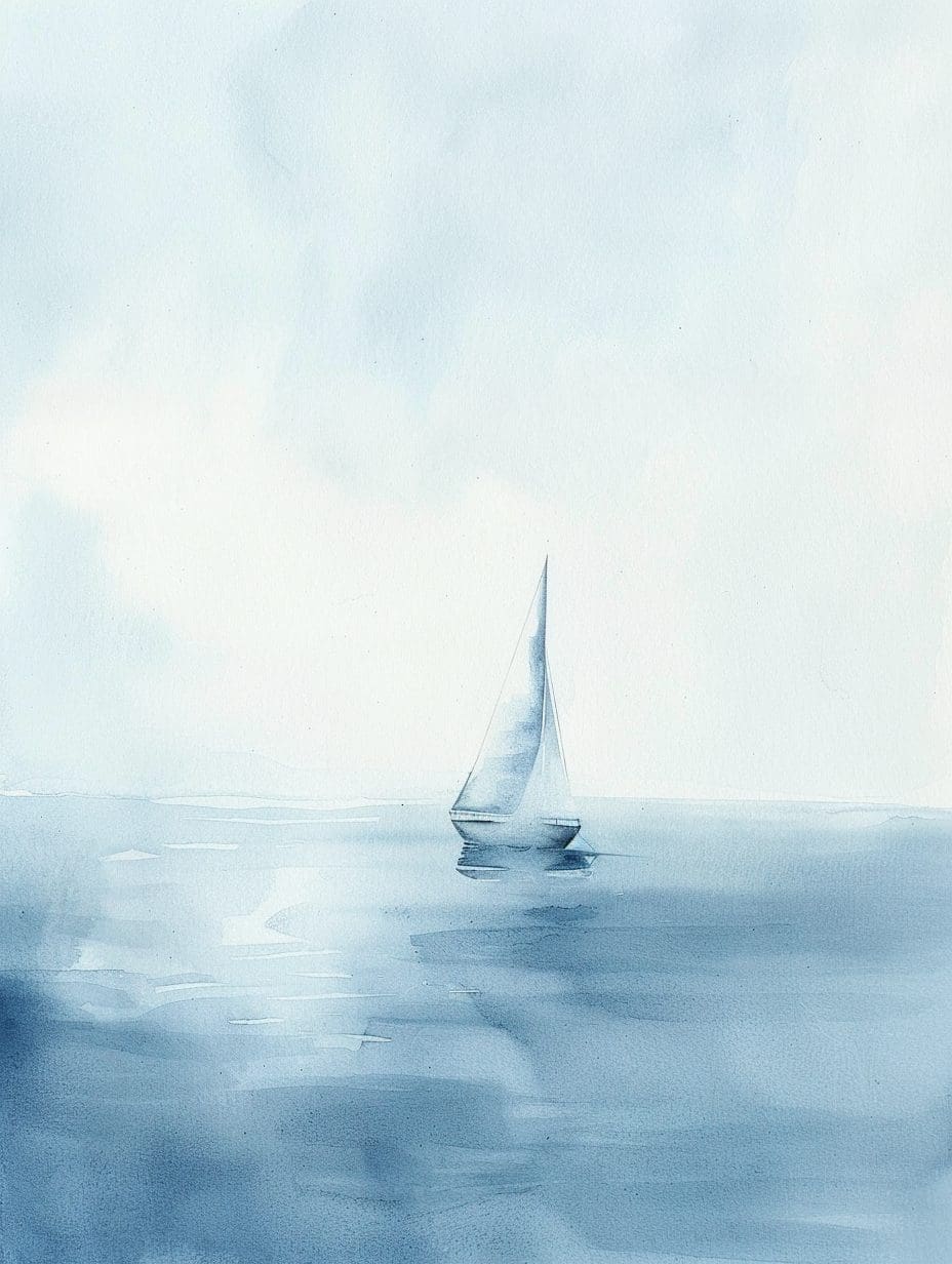 Minimalist watercolor seascape by Zuri Wanjiku — a small sailboat under a soft blue sky. Airy, serene, and delicately modern coastal wall art.