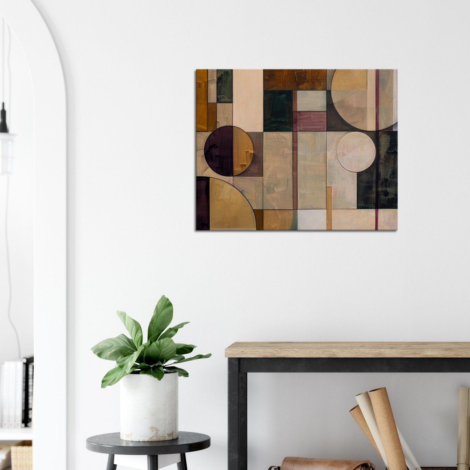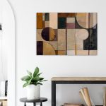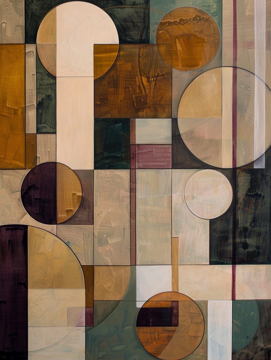 Geometric abstract by Ngozi Adetokunbo — circles and rectangles in earthy Bauhaus tones. Clean, balanced, and artfully modern wall piece.