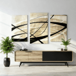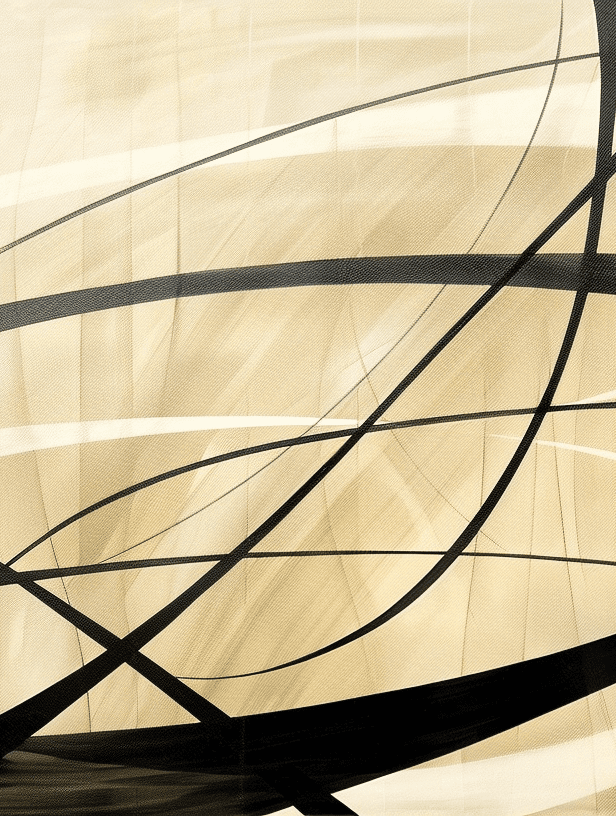 Geometric abstract by Luthando Jacobs — soft beige tones and flowing black lines. Panoramic modern artwork with elegant rhythm and fine texture.