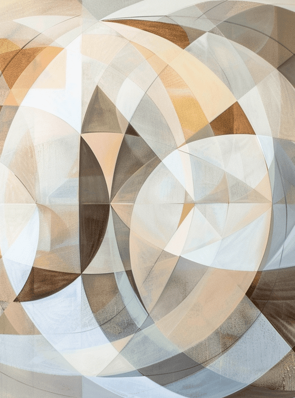Geometric abstract by Chipo Mwansa — angular and circular harmony in taupe, white, and bronze tones. Panoramic modern fine art with connected flow.