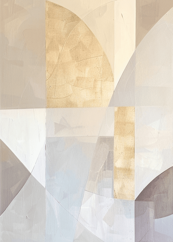 Geometric abstract by Amina Okoye — intersecting forms in beige, white, and gold. Continuous panoramic artwork designed for elegant triptych display.