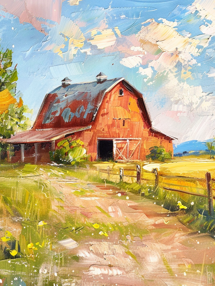 Farmhouse painting by Ngozi Adetokunbo — a red barn in a sunlit meadow with soft brushwork and vintage charm. Warm, rural fine art landscape.