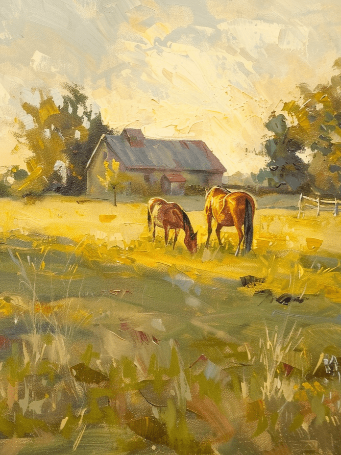 Farmhouse landscape by Thandiwe Mbeki — open pastures with grazing horses in soft golden light. Impressionist texture and serene countryside mood.