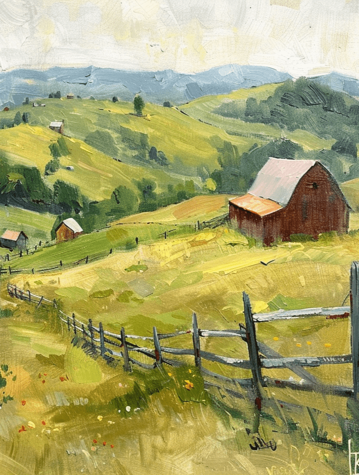 Farmhouse landscape by Amina Okoye — rolling hills with barns and fences painted in soft impressionist oil style. Peaceful and natural rural art.