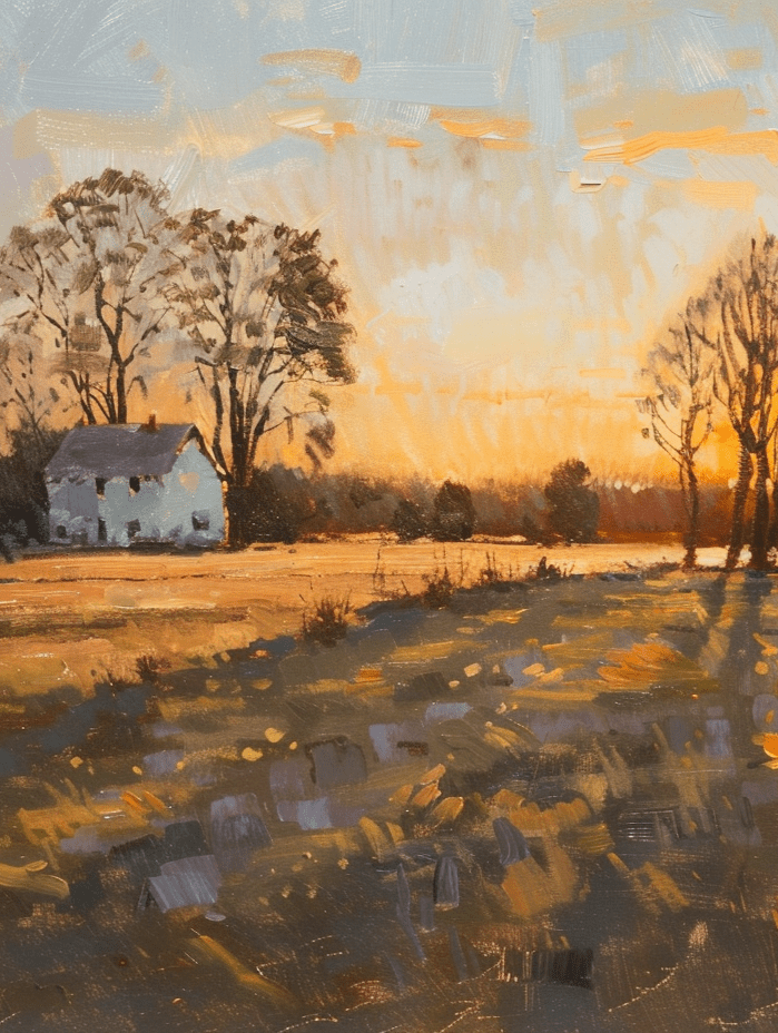 Farmhouse painting by Ngozi Adetokunbo — sunset over golden fields with trees and long shadows. Impressionist realism in warm oil-textured tones.
