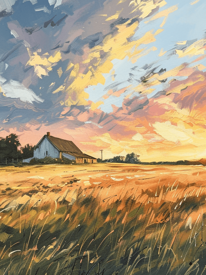 Farmhouse landscape by Zuri Wanjiku — glowing golden-hour sky over warm countryside fields. Oil-textured brushwork and serene natural beauty.
