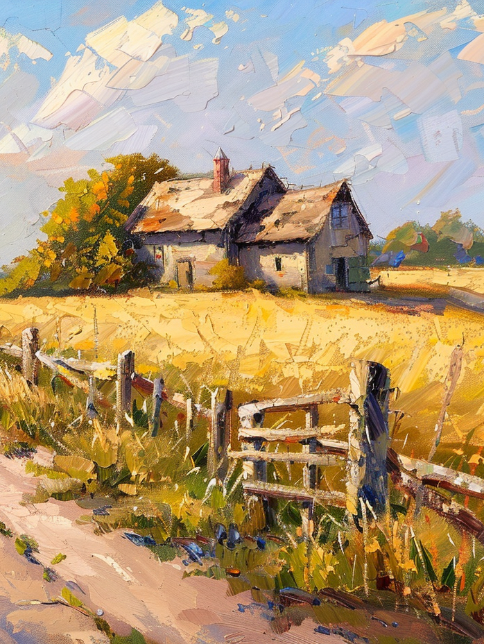 Farmhouse landscape by Chipo Mwansa — dirt path, golden fields, and old fence in oil-on-canvas realism. Warm tones and rustic countryside peace.