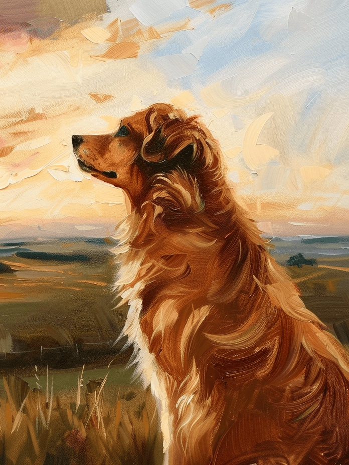 Farm dog painting by Achieng Njeri — warm golden sunset over fields, hand-painted in soft impressionist style. Tranquil and heartfelt countryside art.